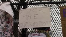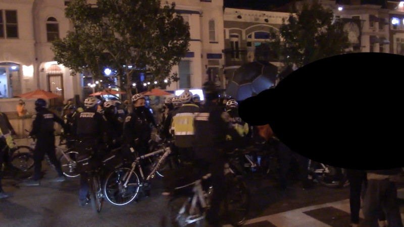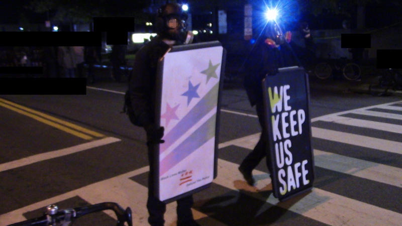 Activists with shields at MPD's darkened and mostly shut down 4D headquarters