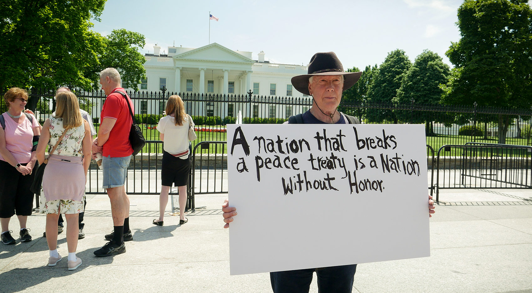Outside the White House, as Trump withdraws from the nuclear accord and argues the case for regime change in Iran, Code Pink responds before being drowned out by MAGA people.