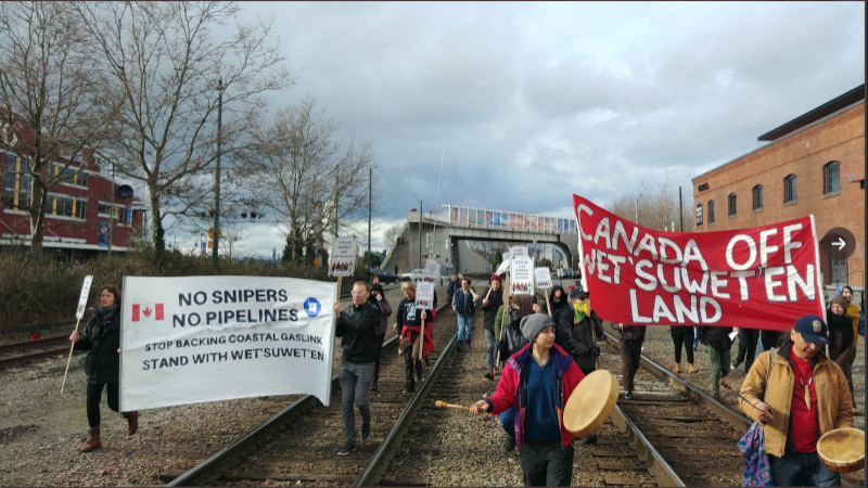 Railroad blockade in Seattle to support Wet'su'weten resistance to the Coastal Gaslink pipeline (Photo by Matt Remle via Twitter)