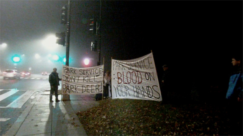 On the evening of 28th of November, the Park Service set up the usual barricades and flashing lights indicating preparatons to shoot deer. By a little after 9PM they disappeared, protesters having threatened to deploy. The Park Service had warned people to be off the trails by 8PM on both Monday and Tuesday nights. They were expected to try again Tuesday, Nov 29 but once again did not show up. Protesters were there instead, and had announced they were coming.