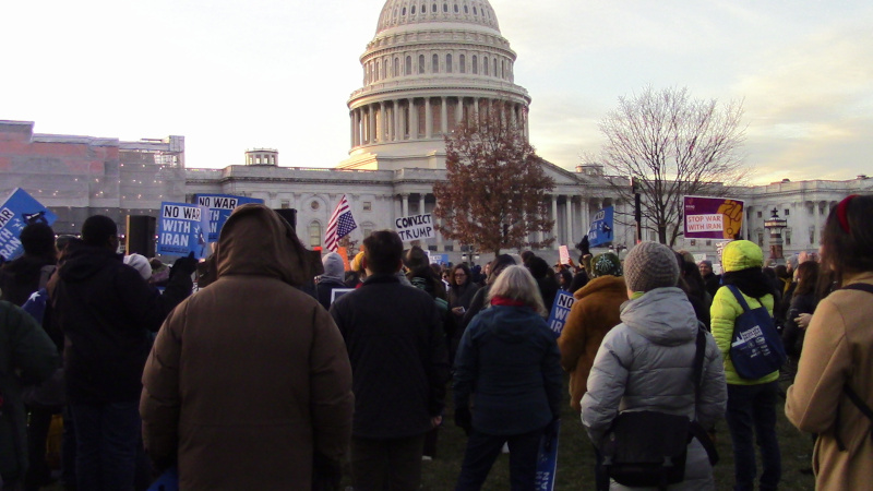 On the 9th of January, antiwar members of Congress and a number of antiwar activists spoke before a substantial rally in front of the US Capitol. They were there to pump up support for a War Powers Act resolution to require Trump to seek authorization from Congress prior to any further military action against Iran. The resolution pass the House 224-194 on mostly party lines shortly after the rally.