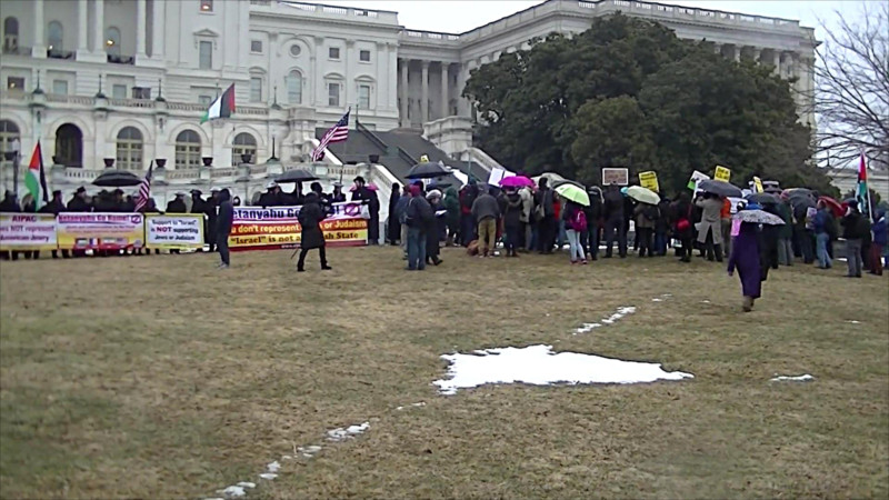 On the 3rd of March, under freezing rain, Jewish Voices for Peace and other groups staged a final protest against Israeli Prime Minister Benjamin Nehtanyahu's warmongering speech. One speaker cited a former Mossad chief as bluntly calling the conflict with Palestine the number one threat to Israel, not Iran's nuclear program. Nehtanyahu's speech seems aimed at sabotaging Obama's negotiations with Iran over nuclear energy and forcing war.