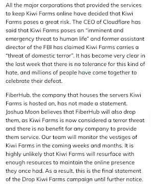 On the 5th of September, the DropKiwiFarms campaign announced victory! The anti-LGBTQ/anti-neurodivergent doxxing and hate site kiwifarms(dot)net had just been booted off Cloudflare for "imminent threat to human life," and less than 24 hours later their backup Russian DDOS protection (DDOSguard) also booted them.